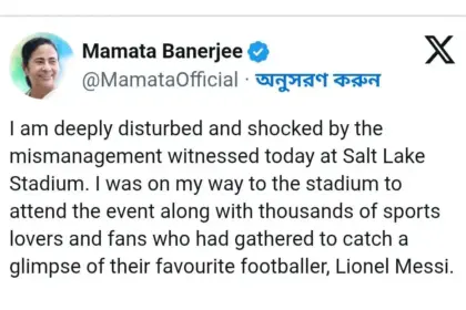 যুবভারতীর বিশৃঙ্খলার জন্য মেসি ও ক্রীড়াপ্রেমীদের কাছে ক্ষমা পশ্চিমবঙ্গের মুখ্যমন্ত্রী মমতা বন্দ্যোপাধ্যায়ের, গঠিত তদন্ত কমিটি